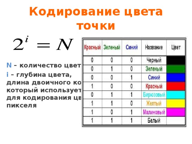 Количество цветов в палитре (N) и количество информации, необходимое для кодирования каждой точки (I), связаны между собой и могут быть вычислены по формуле: